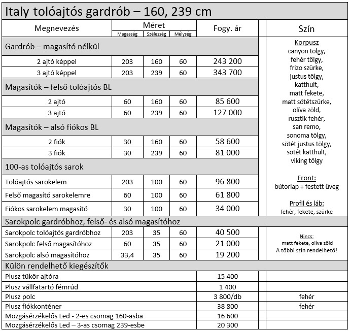 Italy tolóajtós gardrób elemárak